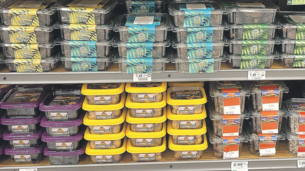 Their stock of Sun-Maid Mission Figs, Dalmatia Fig Spread, and Organic Turkish Figs is displayed with raisins. Holidays and specials result in more sales, he adds. “The peak sales for snacks are the little packs.”