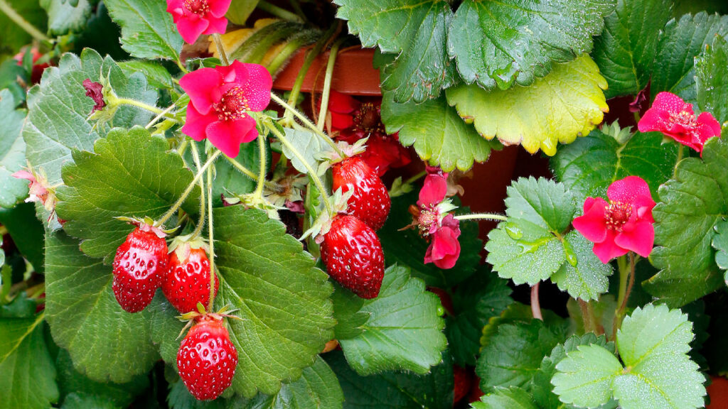Fragaria PRETTY, TASTY ‘Ruby’ offers a Terra Nova twist to berries with large, red-red flowers reminiscent of miniature roses; its blooms create a striking contrast against the plant’s sturdy strawberry foliage. Designed for both beauty and performance, ‘Ruby’ brings ornamental appeal and edible interest to full-sun gardens, hanging baskets and strawberry pots. It also presents strong ecological benefits for wildlife and attracts pollinators to gardens and landscapes.